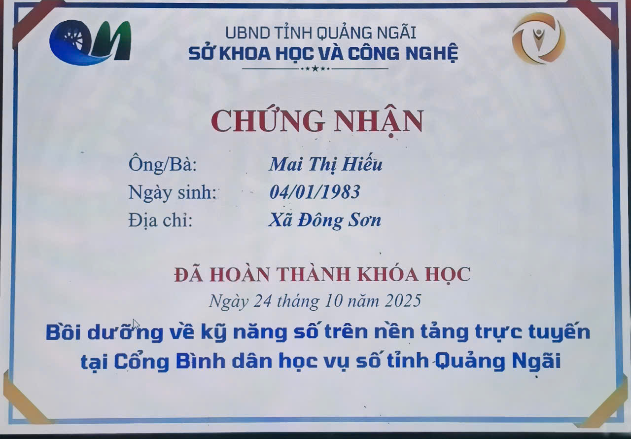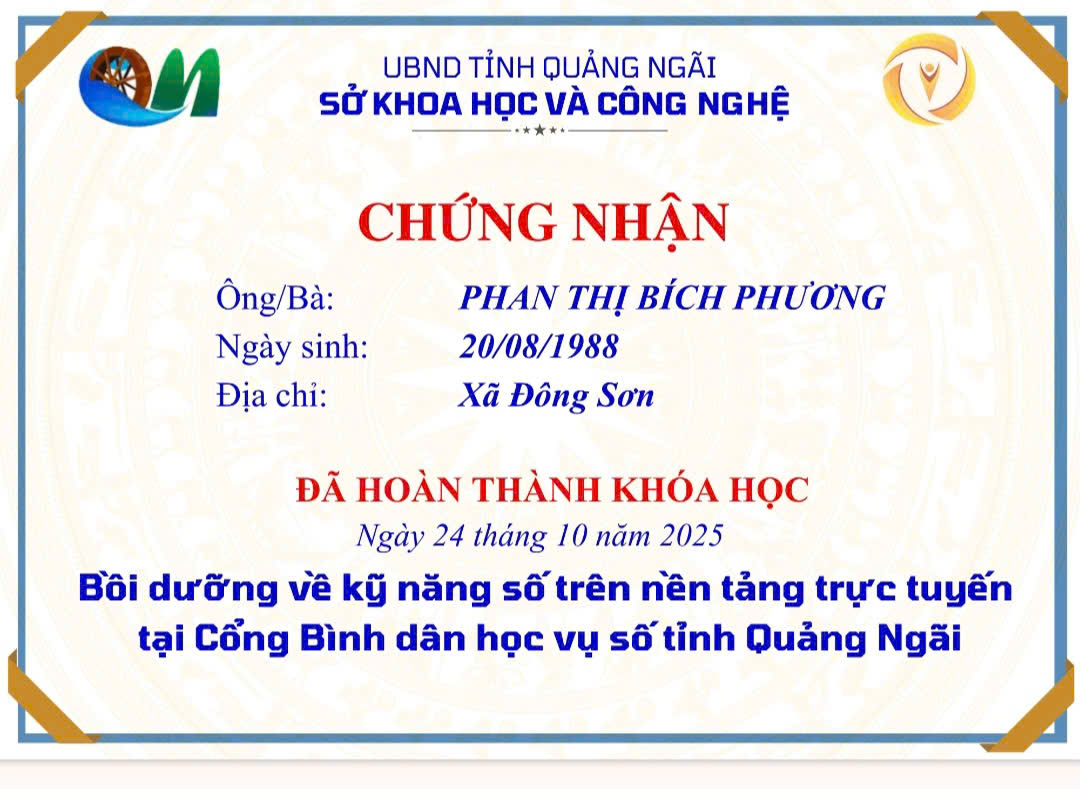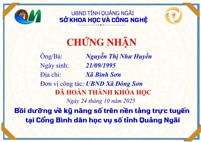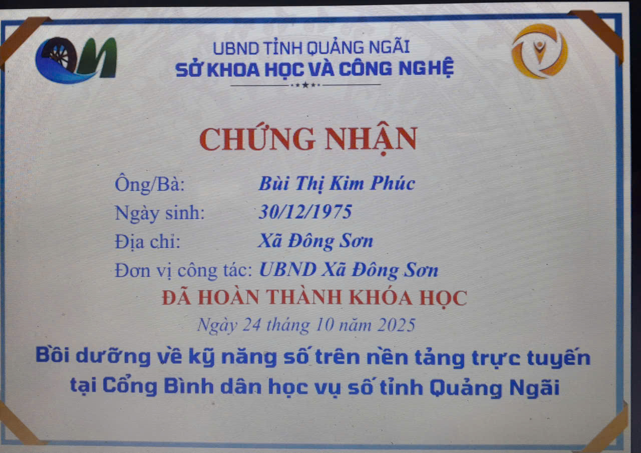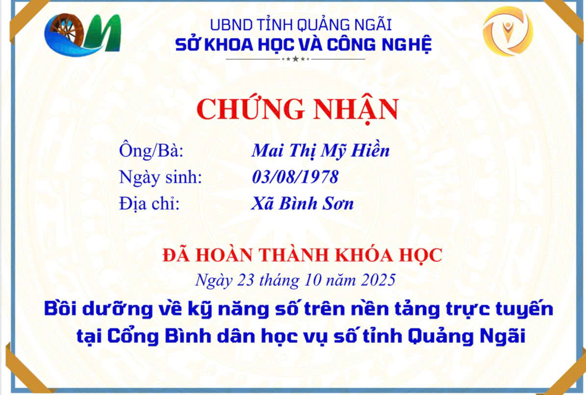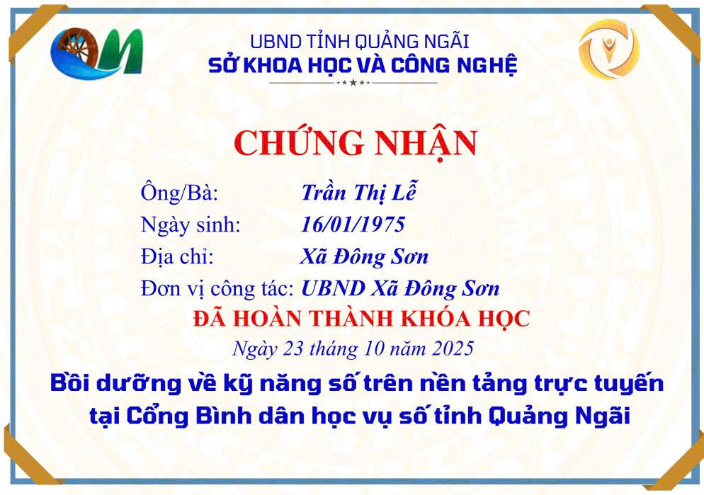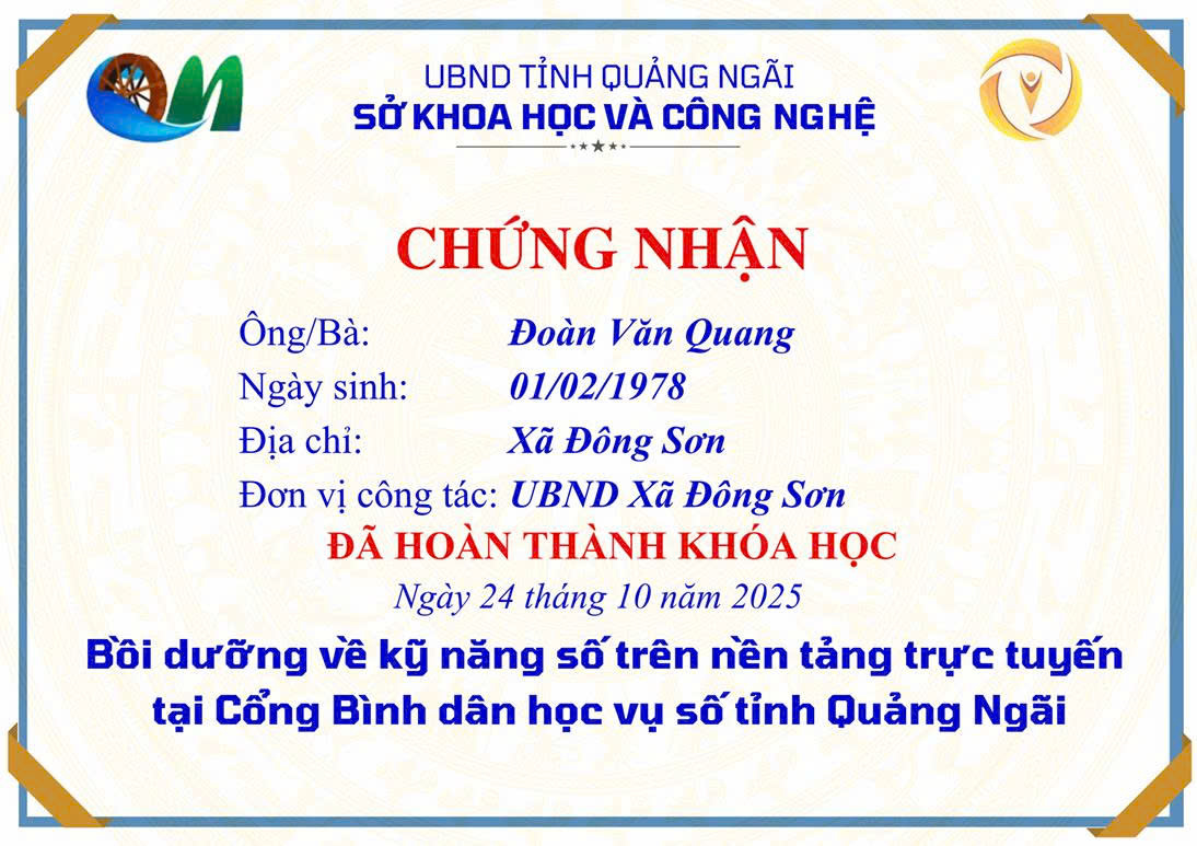 Thực hiện Công văn số 2027/SKHCN-BCVT&CĐS ngày 09/10/2025 của Sở Khoa học và Công nghệ tỉnh Quảng Ngãi về việc triển khai khóa bồi dưỡng kỹ năng số trên nền tảng trực tuyến tại Cổng Bình dân học vụ số tỉnh Quảng Ngãi.