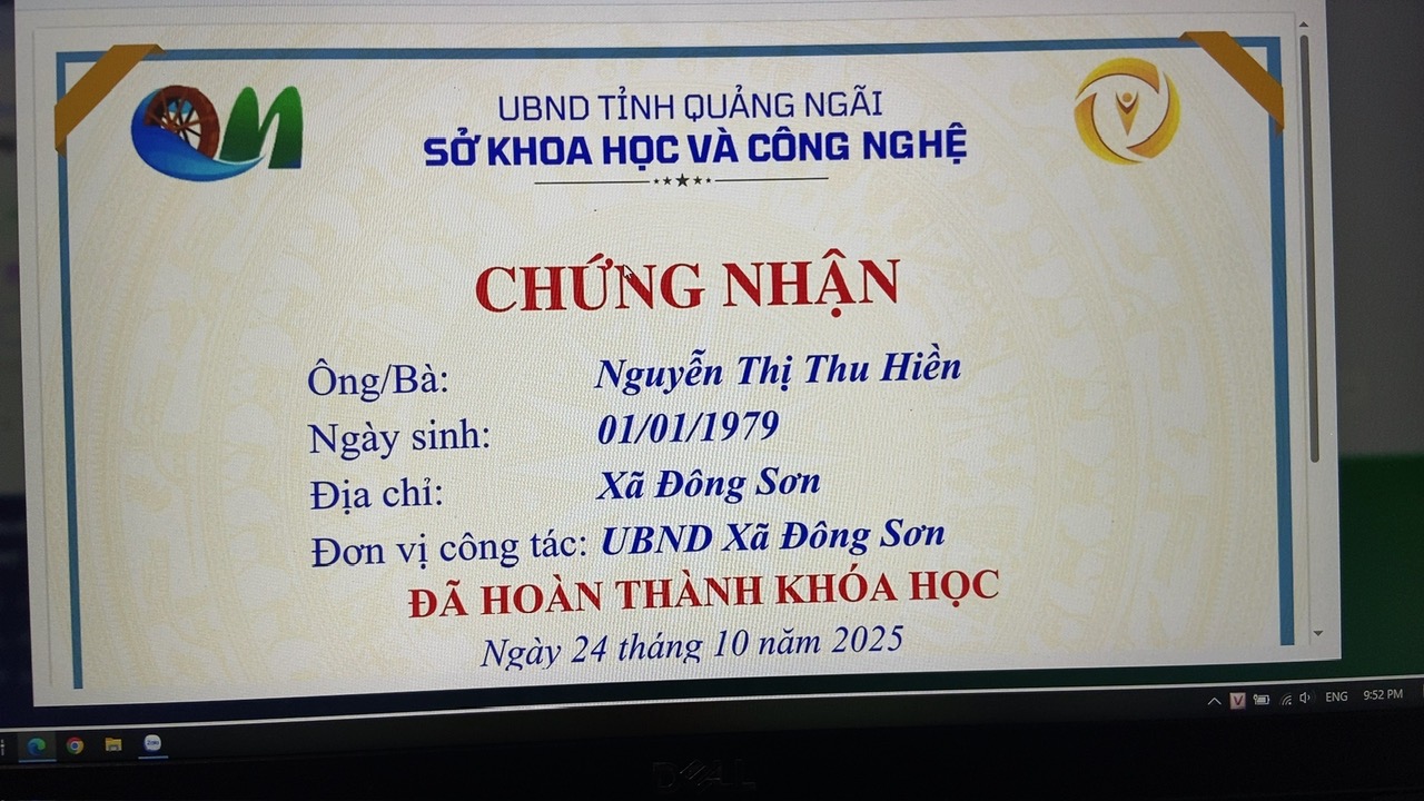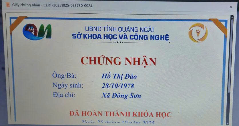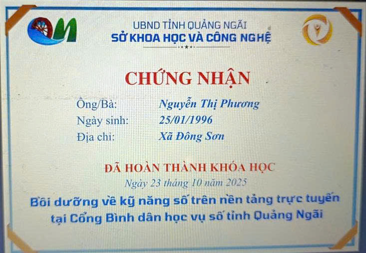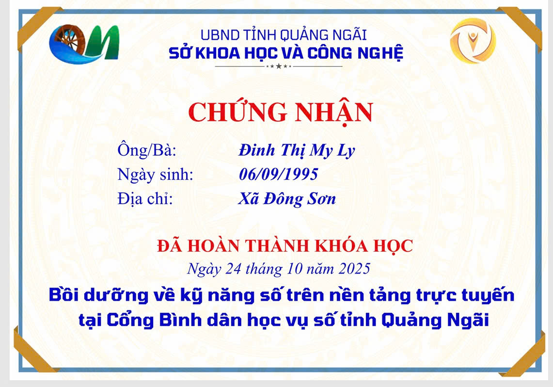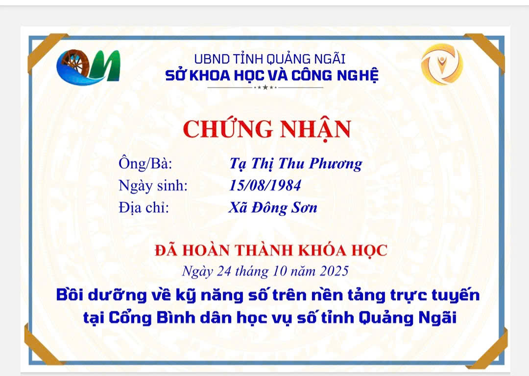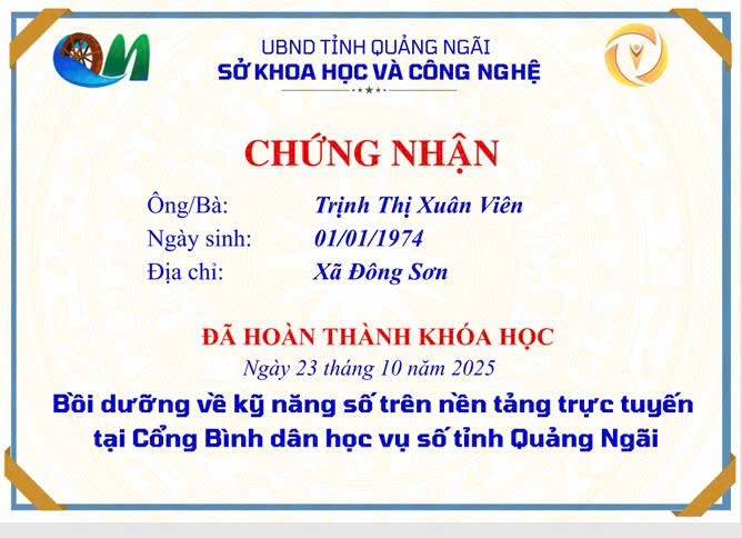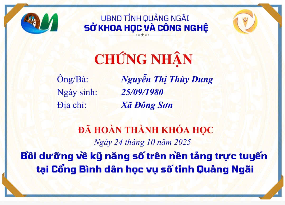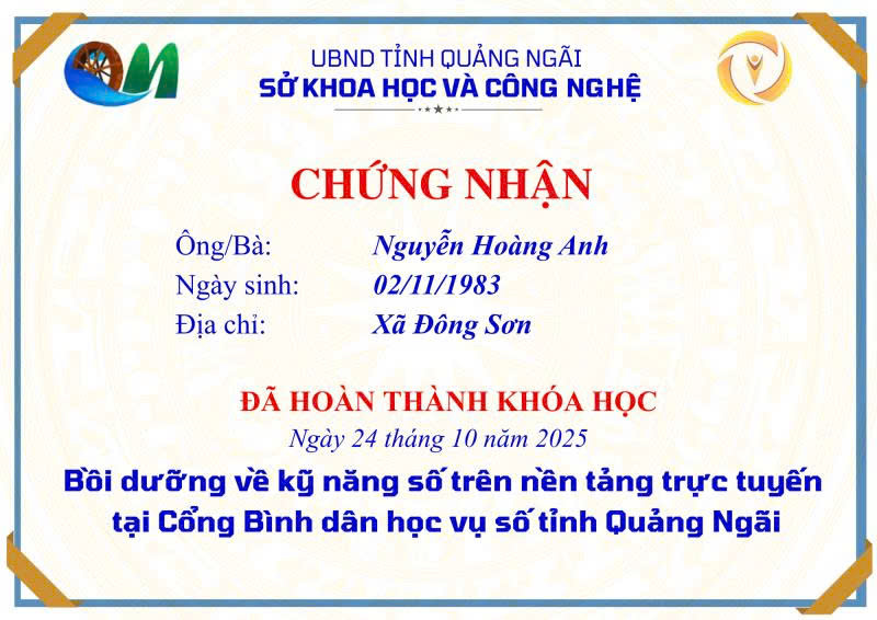 Thực hiện Công văn số 2027/SKHCN-BCVT&CĐS ngày 09/10/2025 của Sở Khoa học và Công nghệ tỉnh Quảng Ngãi về việc triển khai khóa bồi dưỡng kỹ năng số trên nền tảng trực tuyến tại Cổng Bình dân học vụ số tỉnh Quảng Ngãi.