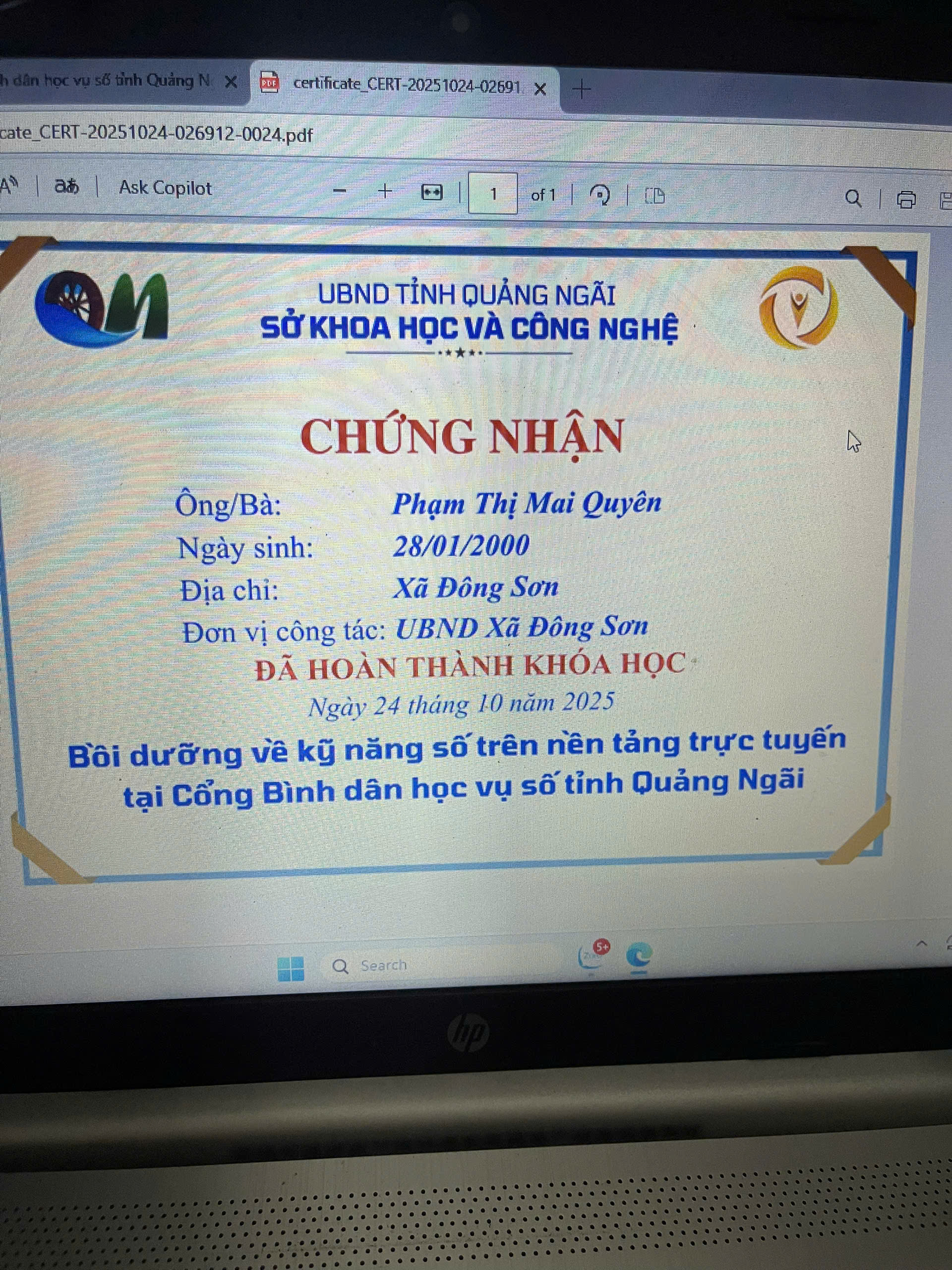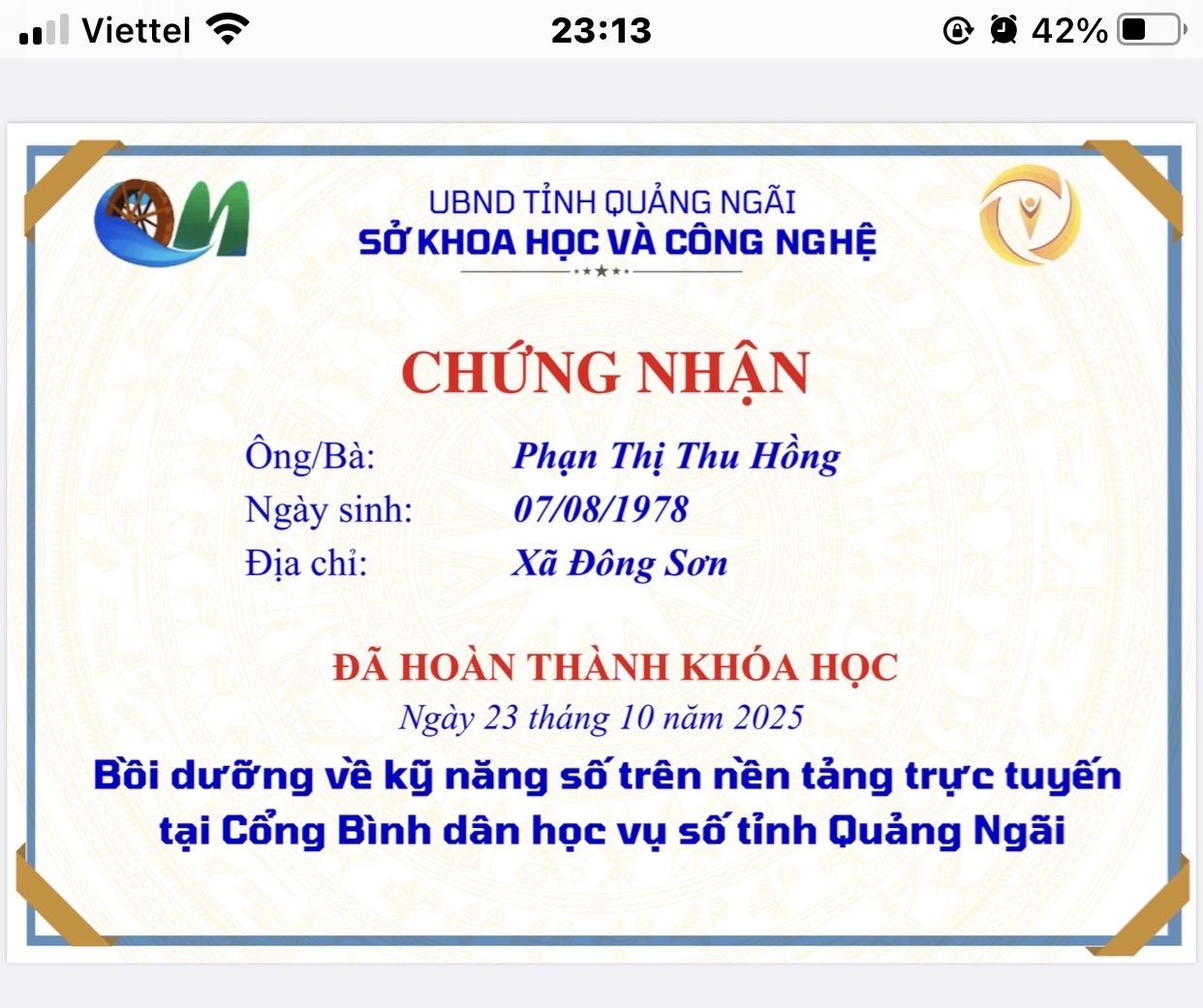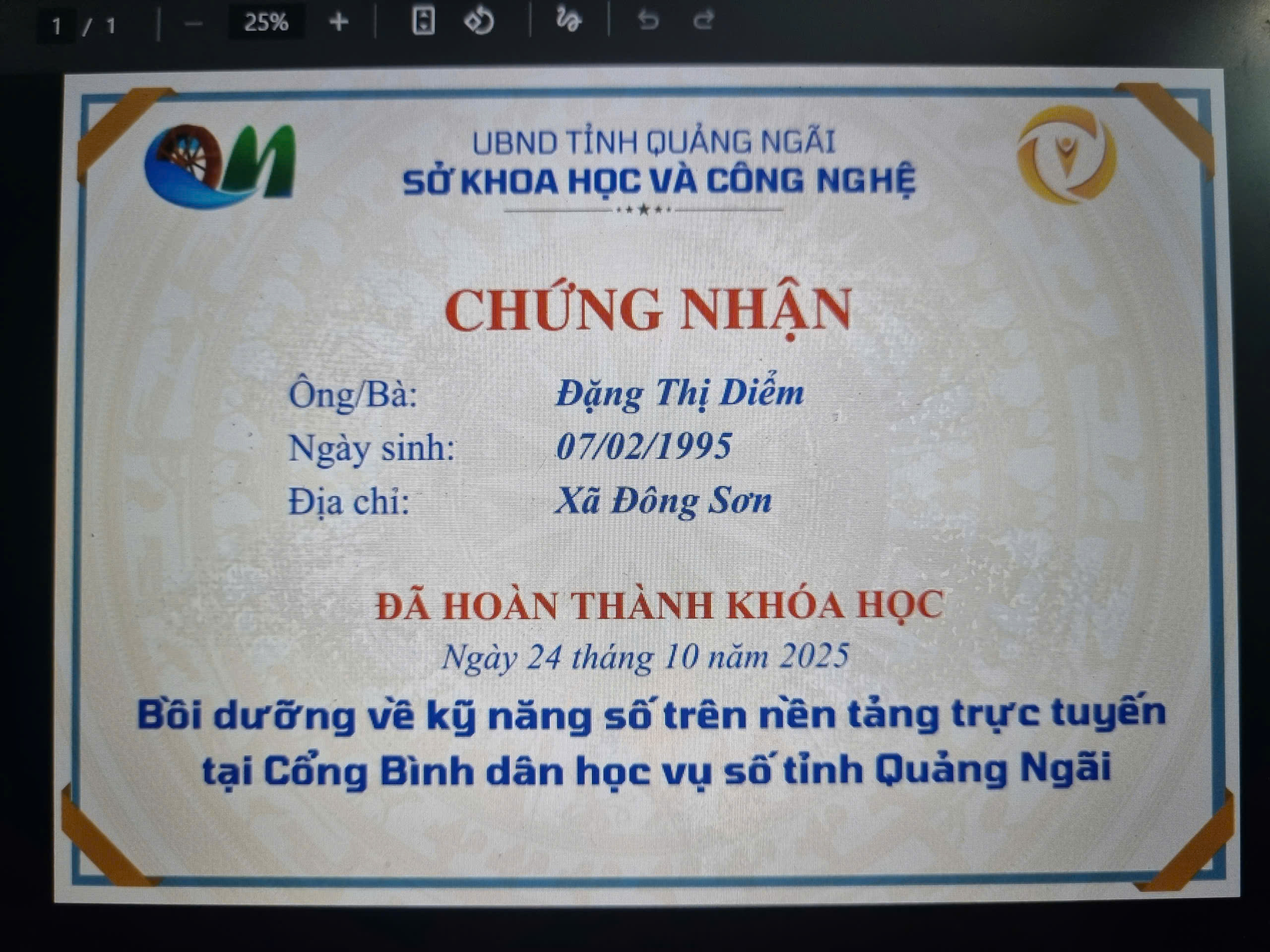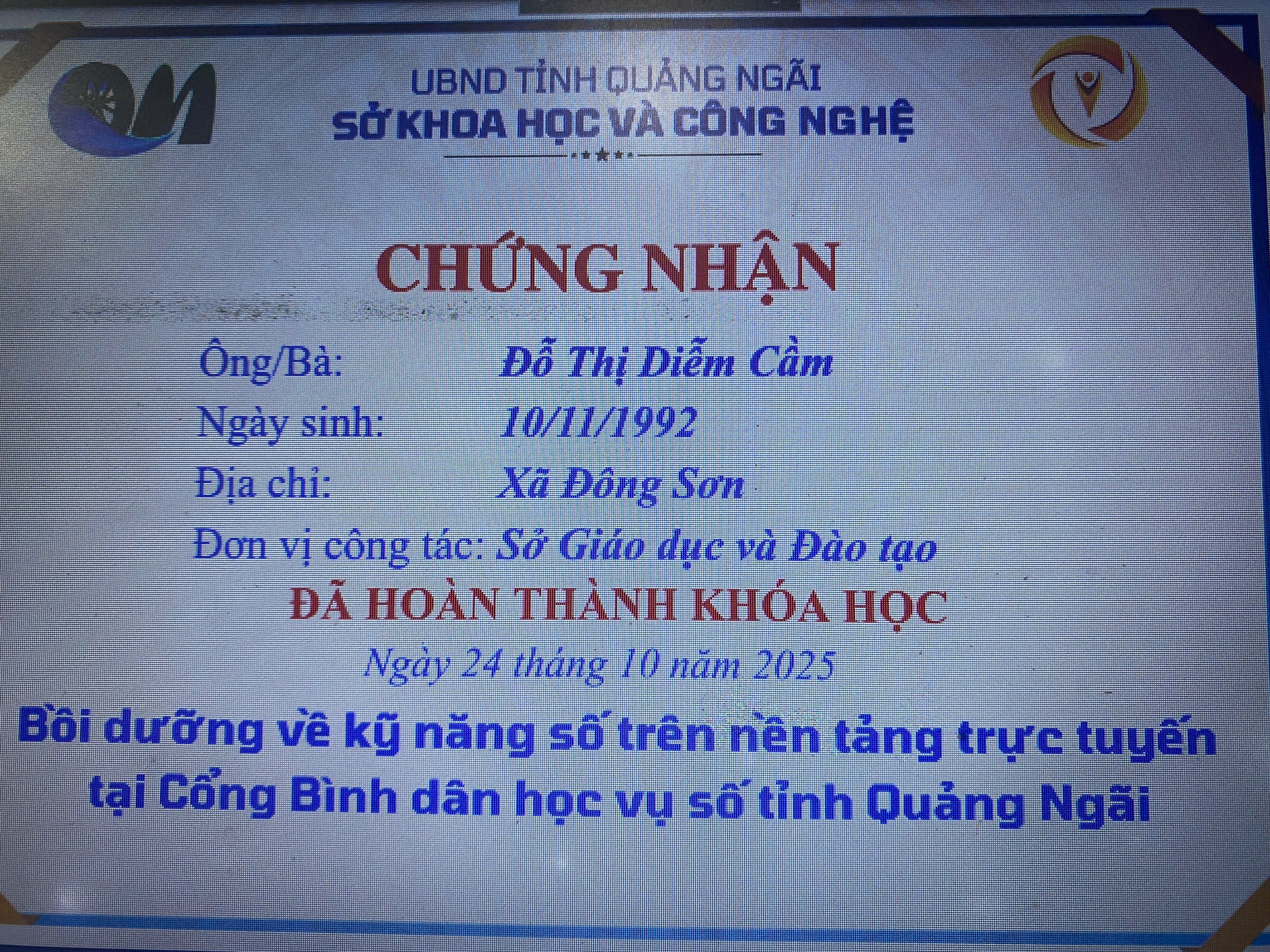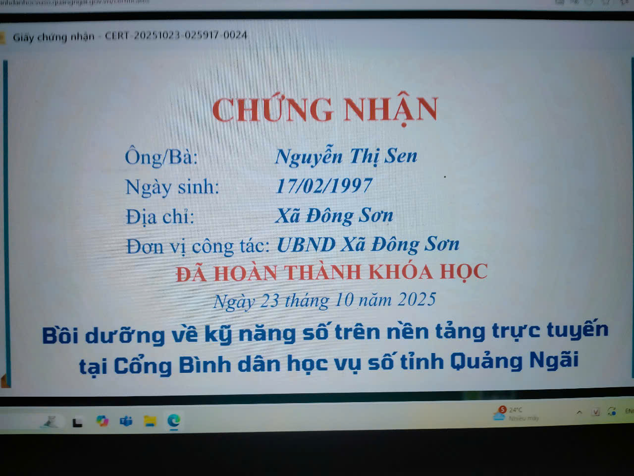 Thực hiện Công văn số 2027/SKHCN-BCVT&CĐS ngày 09/10/2025 của Sở Khoa học và Công nghệ tỉnh Quảng Ngãi về việc triển khai khóa bồi dưỡng kỹ năng số trên nền tảng trực tuyến tại Cổng Bình dân học vụ số tỉnh Quảng Ngãi.